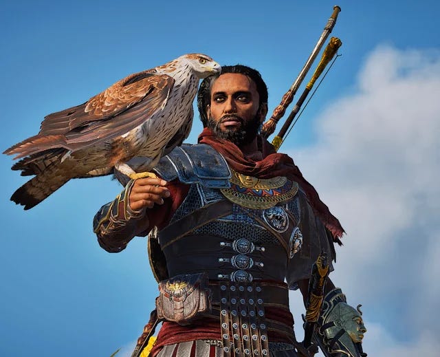 Bayek is a Medjay, Medjays were originally protectors (almost like bodyguards) of the Pharaoh. In the game, they turn the “job” of the Medjay into a sort of Protector of the people. And this, Bayek takes very seriously. He stops whenever anyone seems distressed or like they need help and unquestionably helps no matter what it’s about. Sometimes even when he’s got more pressing matters (such as avenging the death of his son) at hand, he still stops, puts away his personal life and is simply “a feather in the eagle’s wing” “a truth unknown”.