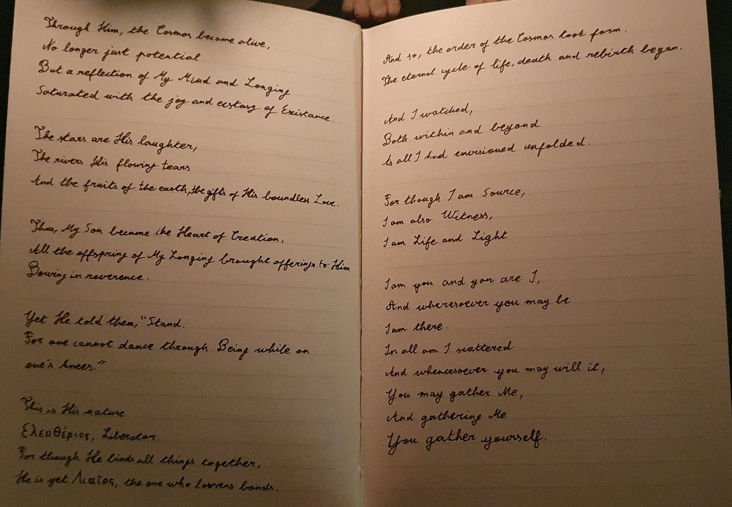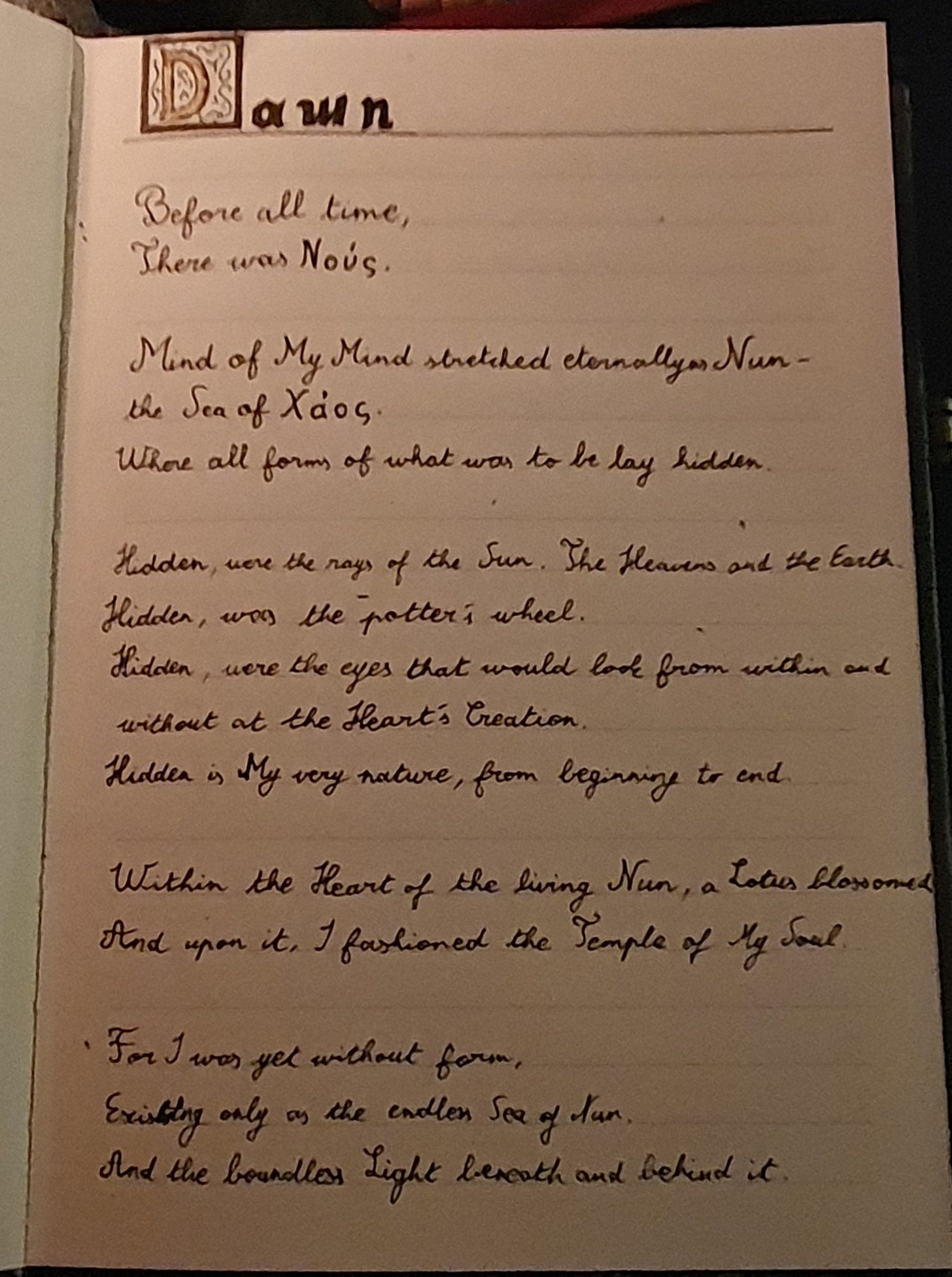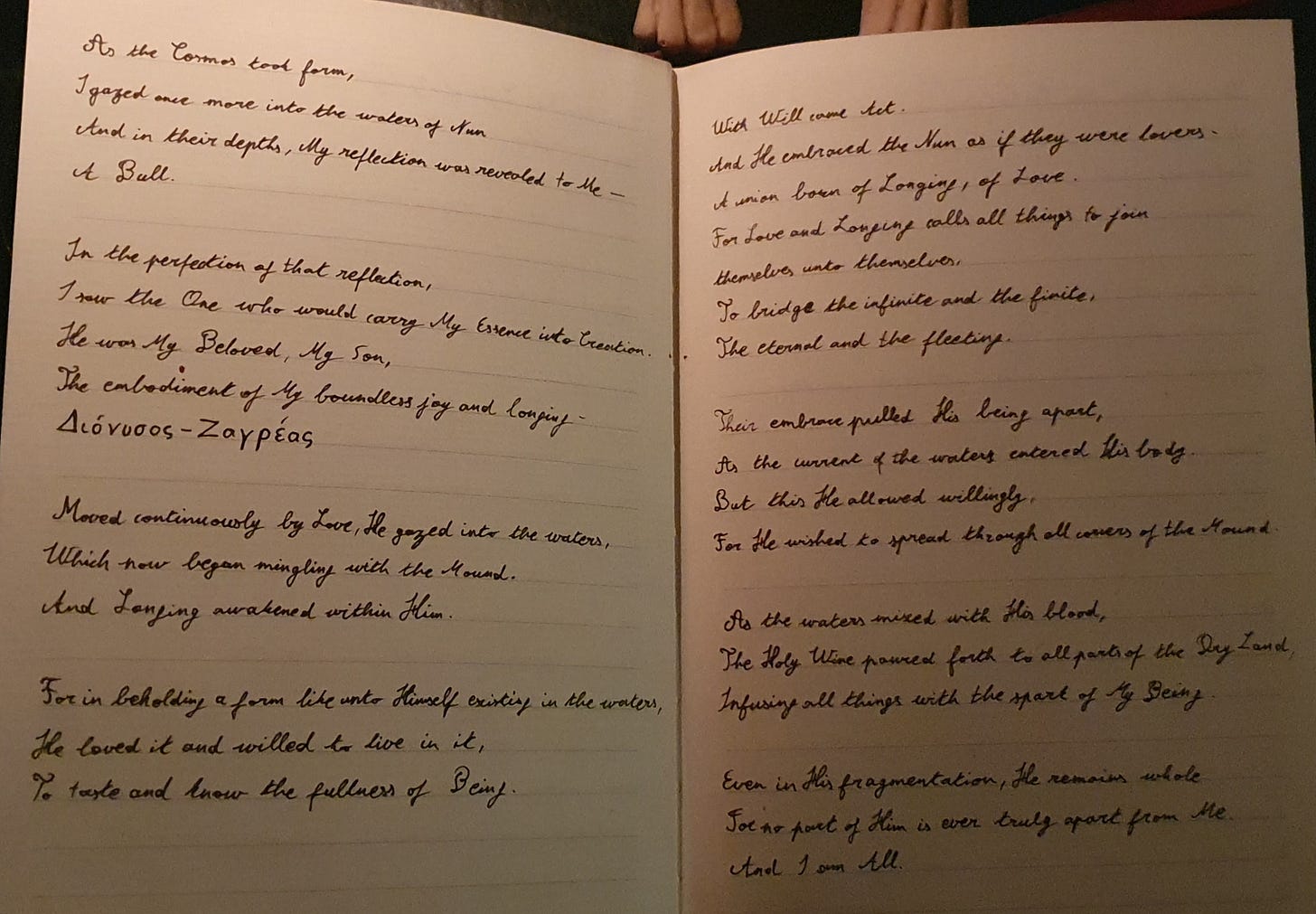 This text of mine is basically just a reworking of Poimandres but from the perspective of The All Mind as Amun, and with a more Egyptian flavor to it. I also decreased the serious weight Poimandres puts on the “fall” of Man into Matter, and changed the tone as more of an accepted loving embrace of that “fall” in the form of the dismemberment myth of Zagreus.