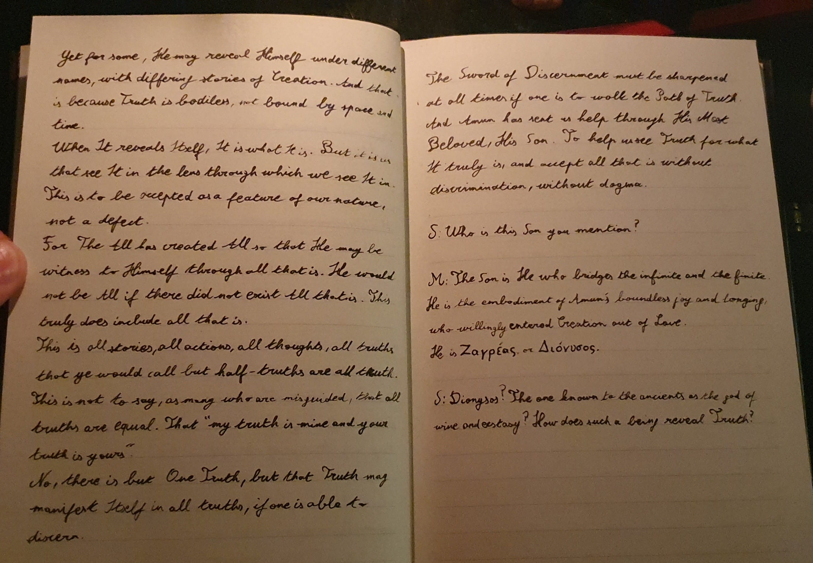 M: The Son is He who bridges the infinite and the finite. He is the embodiment of Amun's boundless joy and longing, who willingly entered Creation out of Love. He is Ζαγρέας(Zagreυs), or Διόνυσος (Dionysos).